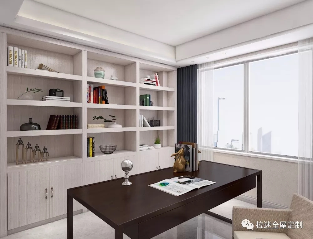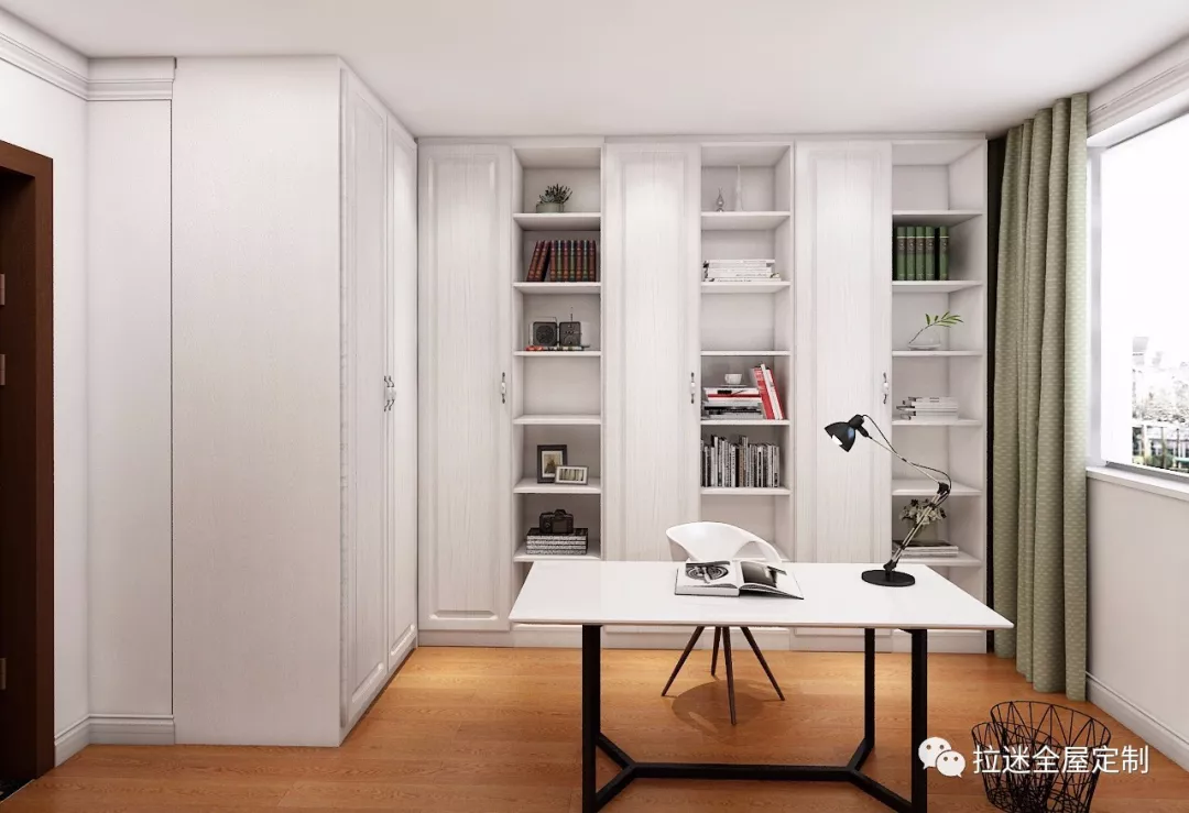 對(duì)于小戶型來說,一體化書桌書柜組合設(shè)計(jì)能夠最大限度地節(jié)省室內(nèi)空間。因?yàn)闀拦窠M合即使是一個(gè)角落,都能安排得當(dāng),不會(huì)占用太多面積。